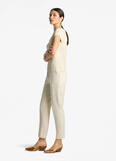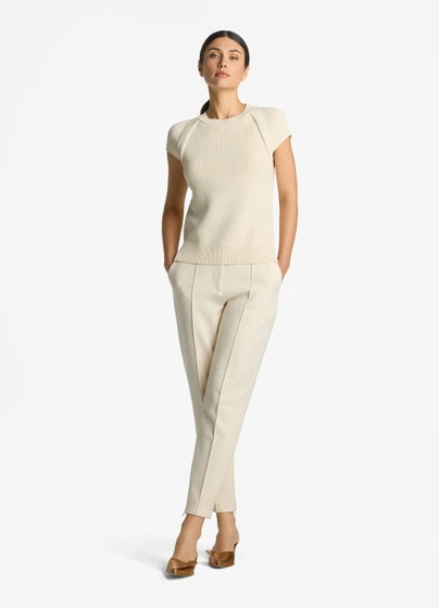 Discover effortless style with our stretch crepe rib knit short sleeve top, designed for the modern woman who appreciates simplicity with a twist. This top features fashionable cap sleeves and raglan-inspired seaming, creating a contemporary silhouette that flatters any figure.