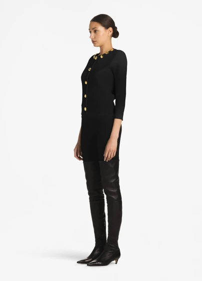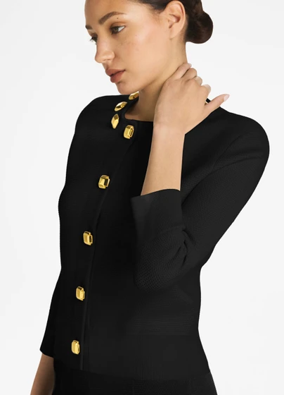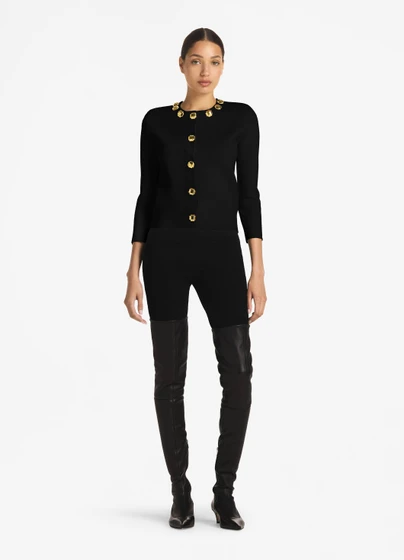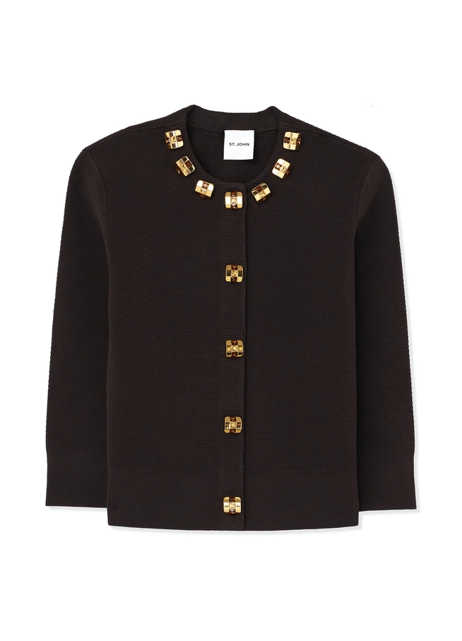 Introducing our Studded Pique Knit Cardigan, where classic meets contemporary style. This chic cardigan features a timeless crewneck design, enhanced by striking gold lining along the collar and front, making it a standout piece for any outfit.